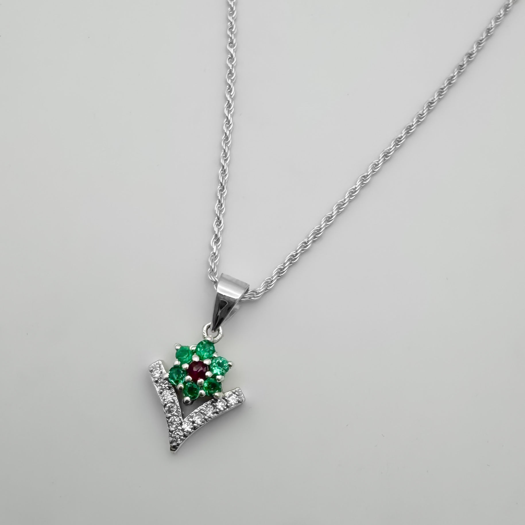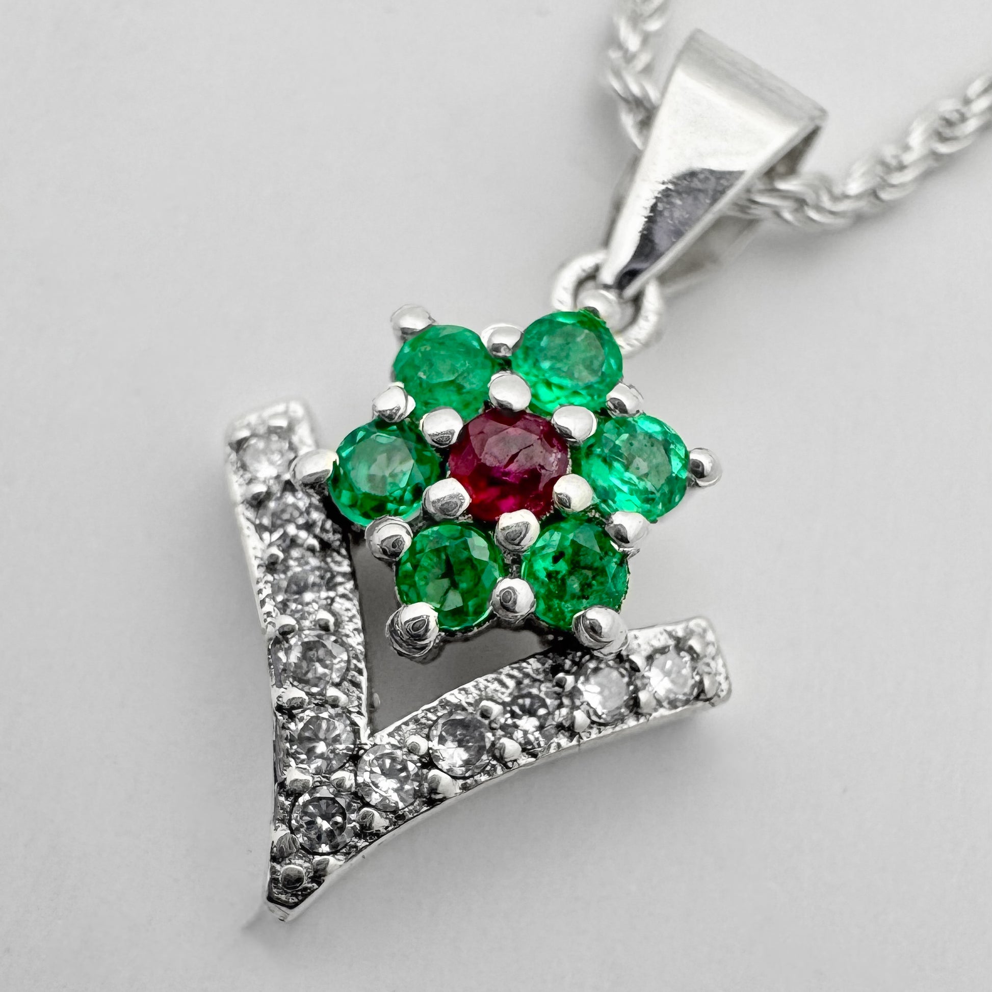 Collar en Plata 925 con dije en forma de flor con Esmeraldas y Rubí.
