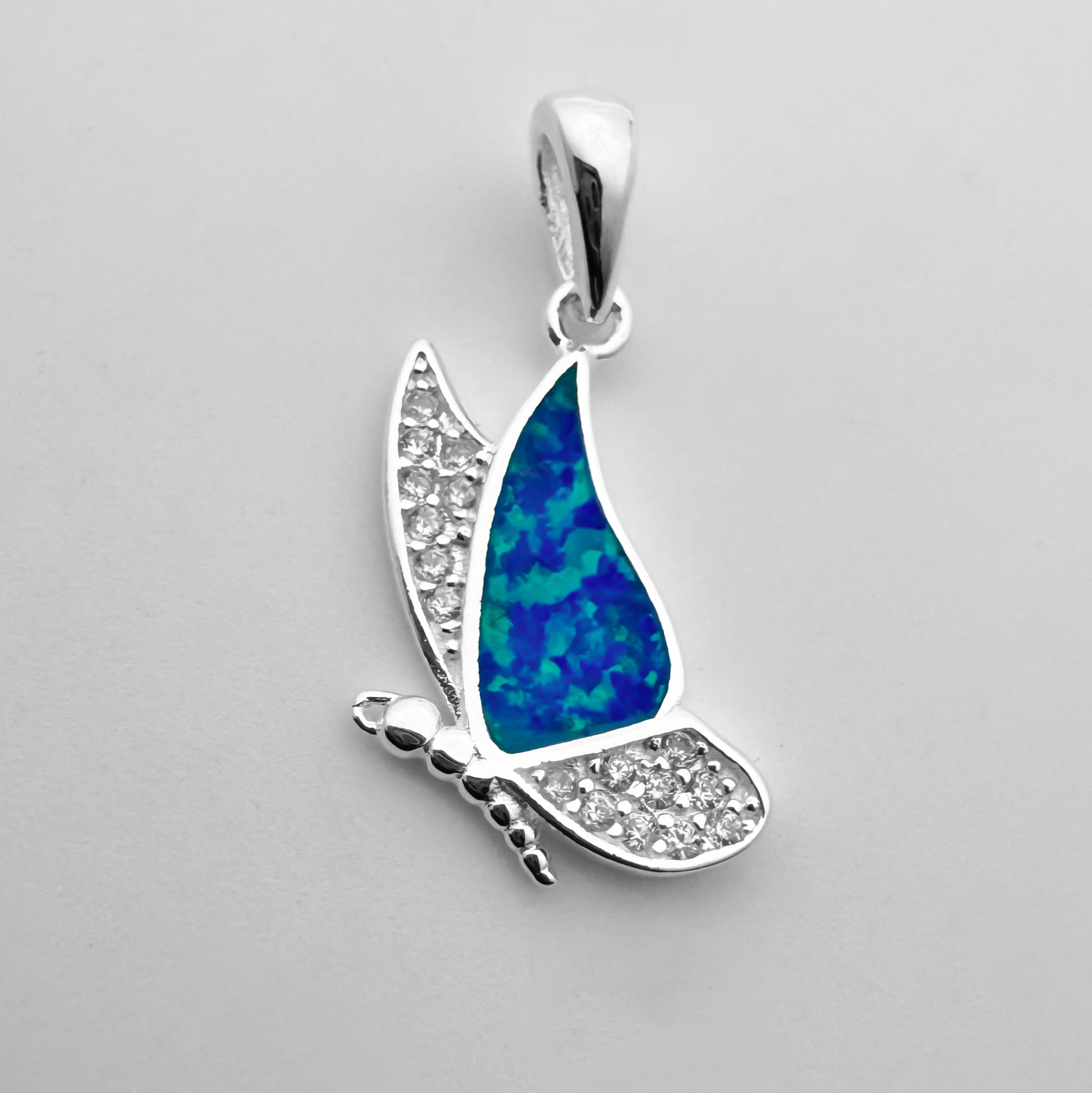 Dije en Plata 925 en forma de mariposa con zircones e imitación de ópalo.