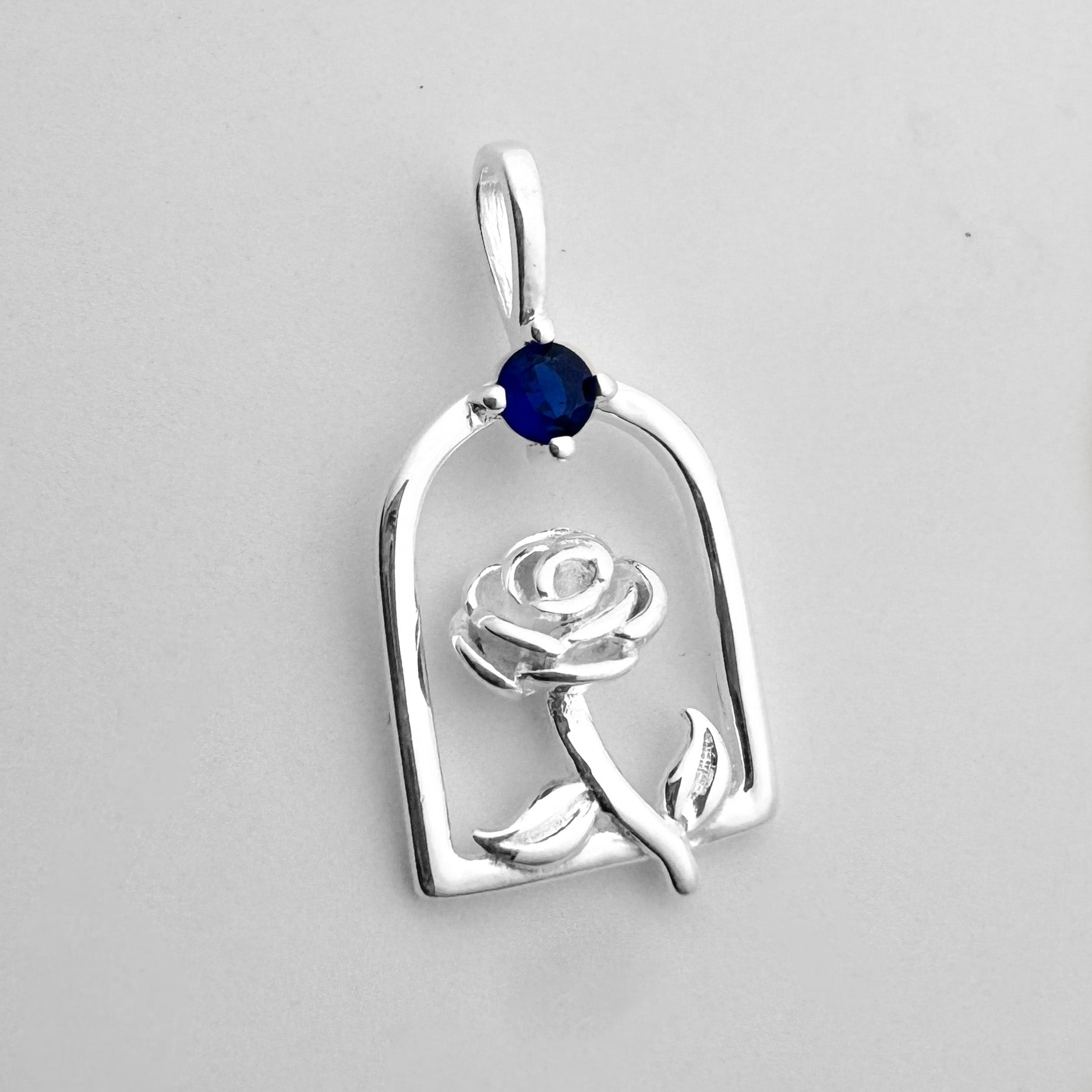 Dije en Plata 925 y zircón azul en forma de rosa enmarcada.