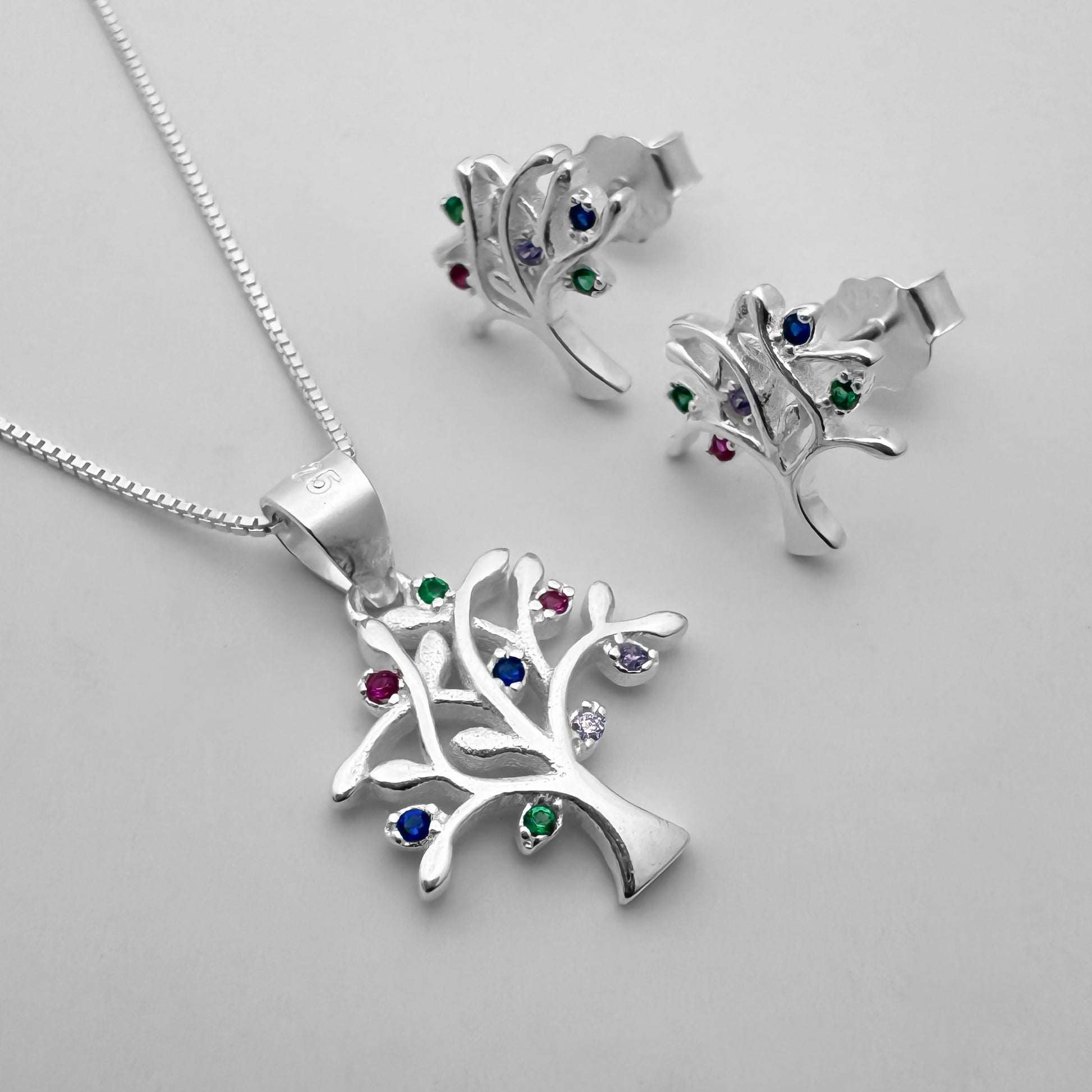 Juego en Plata 925 en forma de árbol de la vida zircones de colores