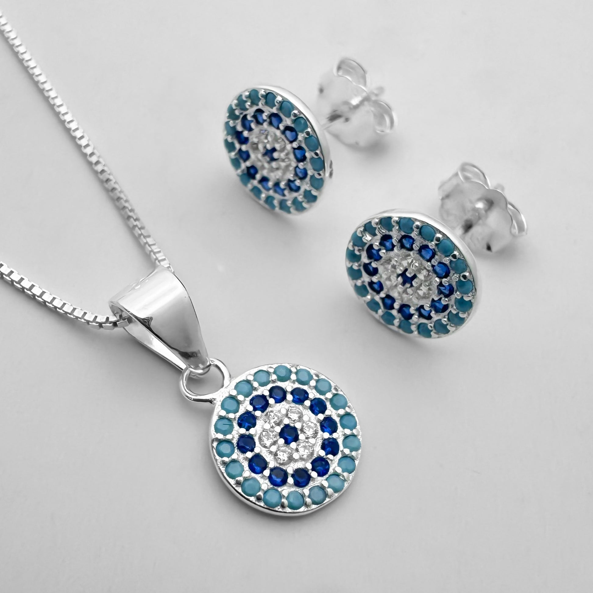 Juego en Plata 925 en forma de cículos con zircones Azules y Blancos