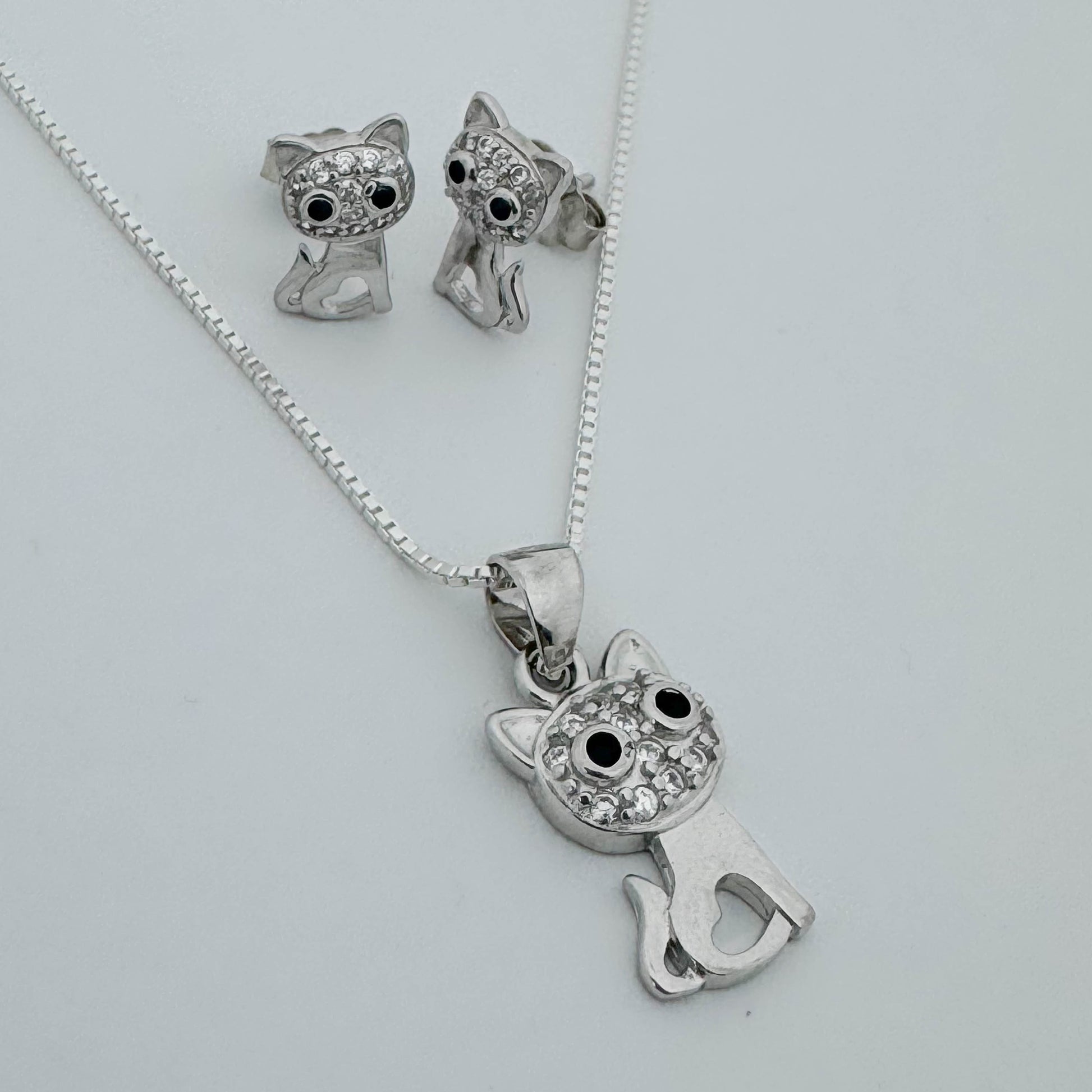 Juego en Plata Ley 925 con zircones blancos en forma de gato.