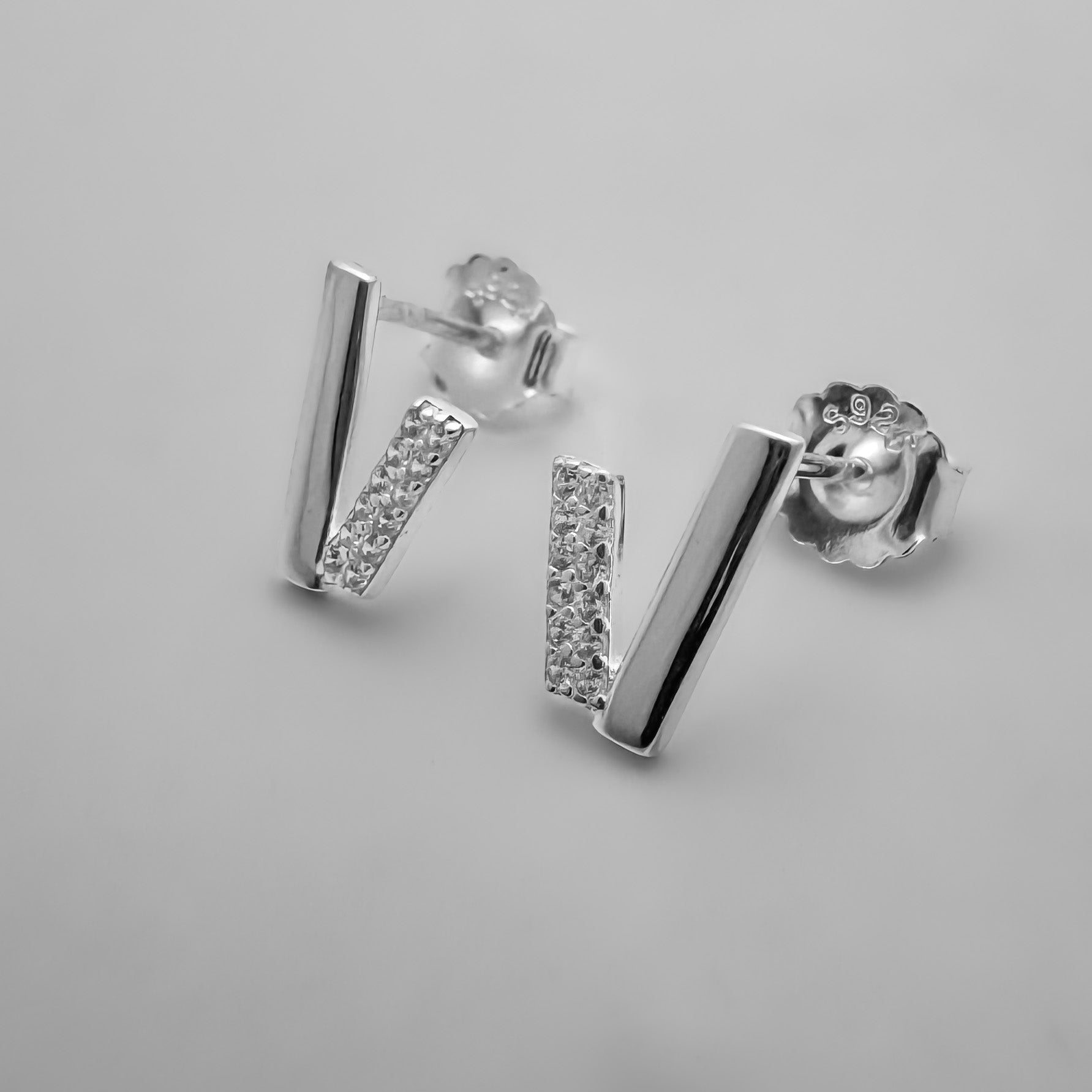 Topos geométricos en forma de V elaborados en plata 925, con un lado pulido y otro adornado con incrustaciones de zircones.